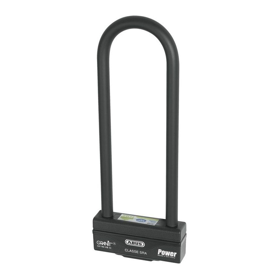 | Type de protection | Anse parabolique carrée de 16 mm de diamètre. Double verrouillage de l’anse dans le boîtier. L’anse, le boîtier et certains éléments de fermeture sont en acier spécial cémenté.Cylindre ABUS X-Plus.Cache-entrée de clé manuel |